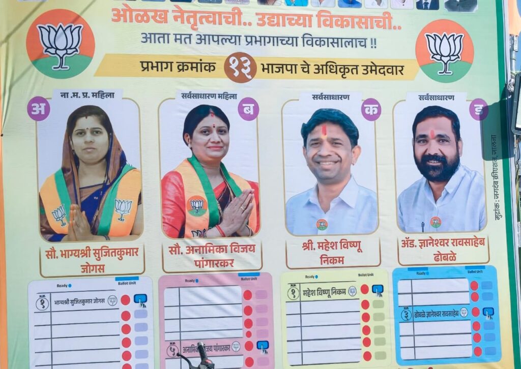 भाजपाचे अधिकृत उमेदवार सौ. भाग्यश्री सुजितकुमार जोगस, सौ. अनामिका विजय पांगारकर, श्री. महेश विष्णू निकम आणि अॅड. ज्ञानेश्वर रावसाहेब ढोबळे हे चारही उमेदवार प्रभाग क्रमांक १३ मधील नागरिकांसाठी परिवर्तनाचा विश्वास घेऊन मैदानात उतरले आहेत. या चारही उमेदवारांचा जनतेशी थेट संवाद, स्थानिक प्रश्नांची जाण आणि काम करण्याची तत्परता यामुळे मतदारांमध्ये त्यांच्याबद्दल सकारात्मक वातावरण निर्माण झाले आहे. रस्ते, पाणीपुरवठा, स्वच्छता, ड्रेनेज, आरोग्य सुविधा, उद्याने, स्ट्रीटलाइट्स तसेच महिला व युवकांसाठी विशेष योजना राबवण्याचे ठोस आश्वासन त्यांनी दिले आहे. भाजपाचे नेतृत्व म्हणजे पारदर्शक कारभार, विकासाची दिशा आणि जबाबदार प्रशासन अशी ओळख आहे. याच ओळखीवर विश्वास ठेवून प्रभाग क्रमांक १३ मधील नागरिकांनी कमळ या चिन्हासमोरील बटन दाबून चारही उमेदवारांना प्रचंड बहुमताने विजयी करावे, असे आवाहन करण्यात येत आहे.