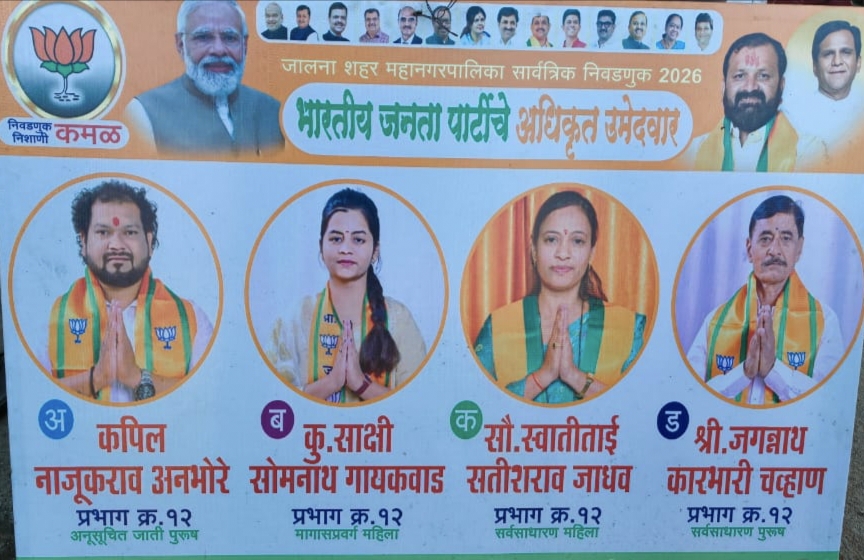 जालना (प्रतिनिधी) : जालना शहर महानगरपालिकेच्या सार्वत्रिक निवडणुकीच्या पार्श्वभूमीवर प्रभाग क्रमांक १२ मध्ये राजकीय हालचालींना वेग आला असून, भारतीय जनता पार्टीने सर्वसमावेशक, सक्षम आणि विकासाभिमुख उमेदवारांची टीम मतदारांसमोर सादर केली आहे.